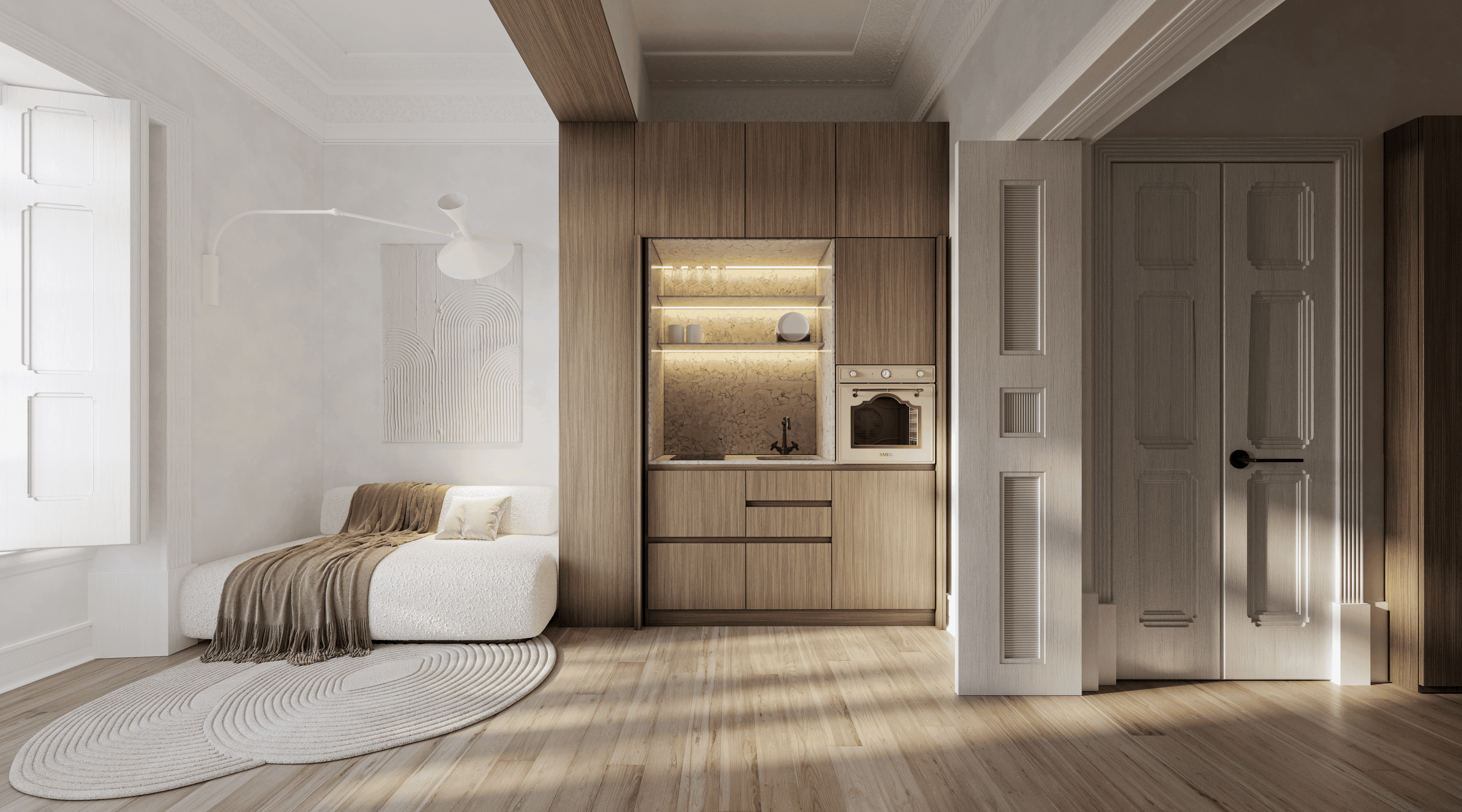 Natural woods used in integrated joinery and furniture.